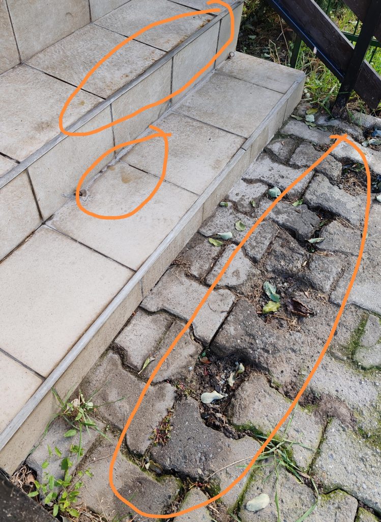 A Fenyves utca 18 ès 20 szám között beszakadt az új járda. Veszélyes!